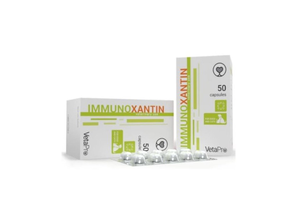 Doplňkové krmivo pro psy a kočky k posílení buněčné a humorální imunity. Pomáhá v boji proti virům, bakteriím a maligním buňkám. Imunoxantin je zdrojem silných ochranných a posilujících látek na imunitu (β-1,3 / 1,6-glukan, extrakt z Echinacea purpurea, vitamín C, zinek a astaxanthin), které stimulují obranný systém organismu. Immuno lze podávat psům a kočkám, kteří jsou ohroženi nebo trpí bakteriálními nebo virovými infekcemi, březím zvířatům, které přenesou imunitu na potomstvo, velmi mladým nebo starým jedincům. Dále psům a kočkám s onkologickým onemocněním.