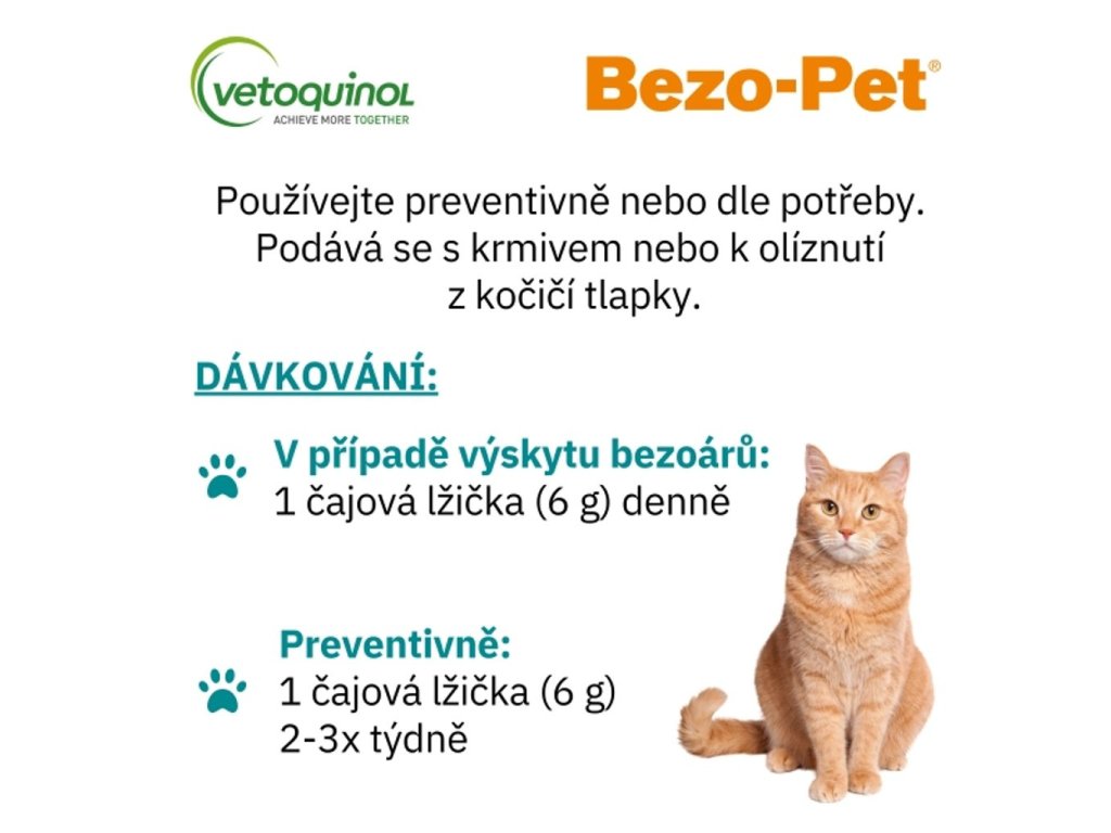 - Při výskytu trichobezoárů: 1 malá lžička (cca 6g) 1x denně
