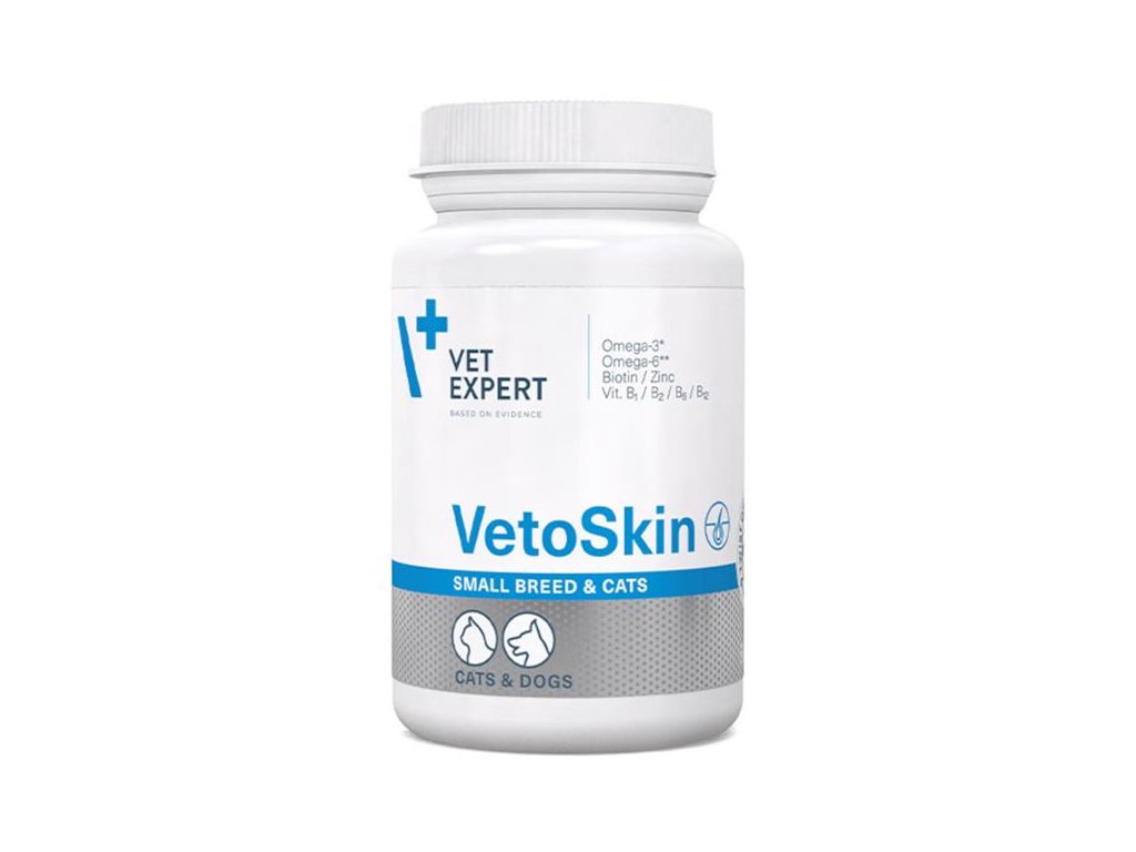 Doplněk stravy pro kočky a psy malých plemen podporující udržení optimálního stavu kůže a kvality srsti. Přípravek VetoSkin Small Breed and Cats je vhodný pro zvířata se suchou kůží, matnou srstí a s nadměrným vypadáváním srsti.