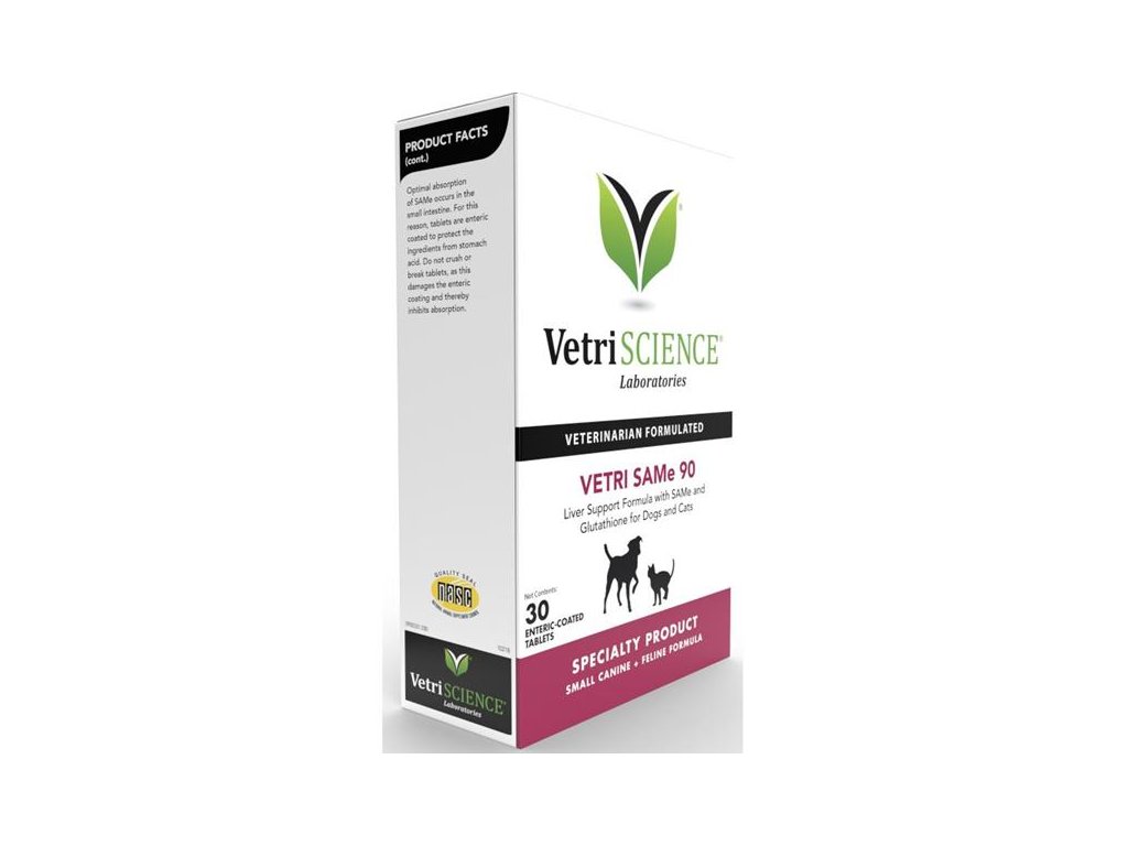 Tento potravní doplněk pro správnou funkci jater je určen pro malé psy a kočky a obsahuje 90 mg SAMe (S-denosyl-metioninu) v jedné tabletě.
