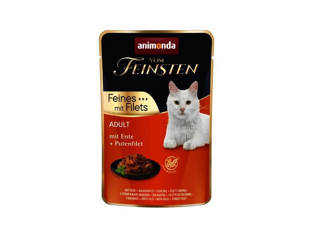 Vom Feinsten Adult Feines mit Filet - kachna a krůtí filet představuje vyváženou, chutnou a zdravou výživu na nejvyšší úrovni. Kvalita masitých ingrediencí v jemných kouscích v kombinaci s jemnou omáčkou a nejjemnějšími kousky filé zaručují jedinečný požitek.