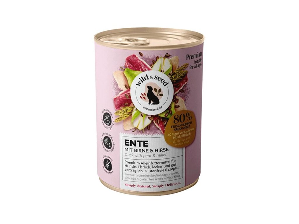 Prémiová konzerva Wild & Seed je pečlivě vytvořená pro psy všech kategorií včetně psů s alergiemi a citlivým trávením. Monoproteinová receptura dodává snadno stravitelné, vysoce kvalitní bílkoviny z kachního masa, které tělo vašeho psa snadno vstřebá a využije. Hypoalergenní složení obohacené o mrkev, proso, lněná semínka a hrušku poskytuje kompletní, lahodnou a vyváženou stravu.