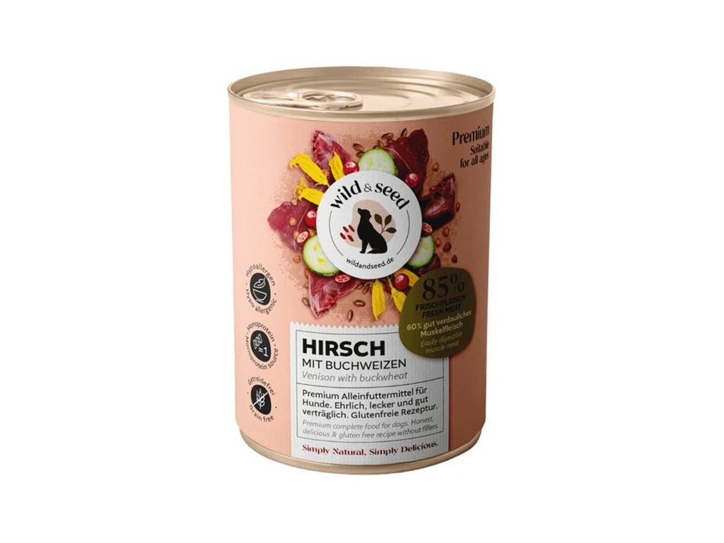 Prémiová konzerva Wild & Seed je pečlivě vytvořená pro psy všech kategorií včetně psů s alergiemi a citlivým trávením a na BARF stravě. Receptura dodává snadno stravitelné bílkoviny ze zvěřiny, která je šetrná k trávicímu systému a také jde o vysoce udržitelný zdroj masa. Hypoalergenní složení obohacené o cuketu, lněná semínka, pohanku a brusinky poskytuje kompletní, lahodnou a vyváženou stravu.