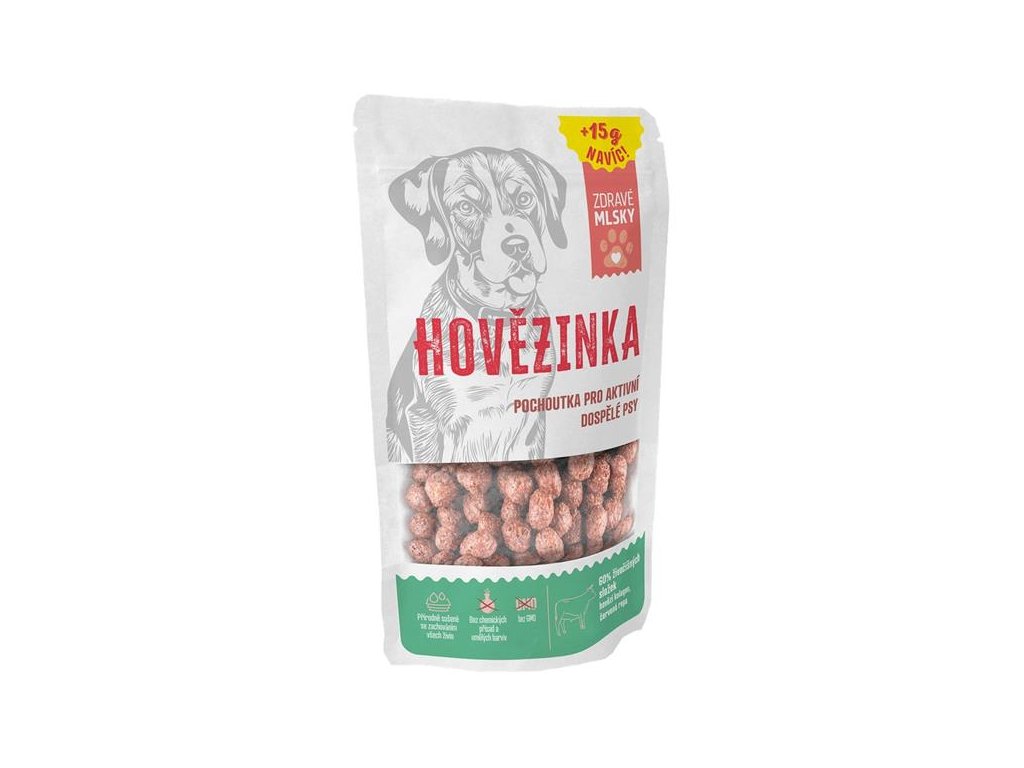 Zdravé mlsky Hovězinka jsou ideální odměnou pro aktivní dospělé psy všech plemen. Základ pamlsků tvoří sušené maso, přidaná červená řepa a mrkev poskytují vitamíny (A, C, kyselinu listovou), minerály (železo, draslík), vlákninu pro trávení a antioxidanty a lososový olej podporuje zdraví kůže a lesk srsti. Pamlsky vyrobené v České republice jsou přírodně sušené se zachováním všech živin, bez obsahu GMO, chemických přísad a barviv.