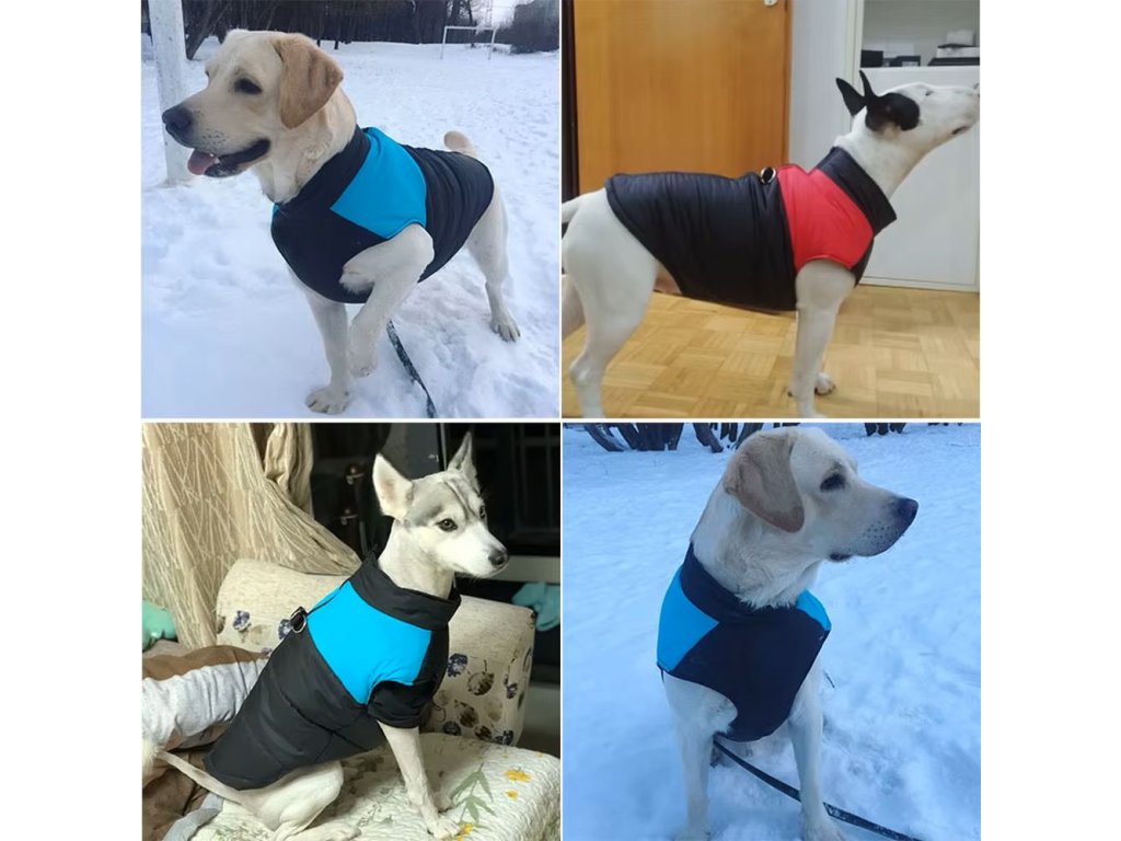 Vesta je vyrobena z kvalitního polyesteru, který je nepromokavý a větruodolný, takže spolehlivě ochrání psa před chladem, větrem i vlhkostí. Díky lehké, ale hřejivé konstrukci udrží tělesné teplo, aniž by psa zatěžovala nebo omezovala v pohybu 🐾✨. Na přiložených fotografiích je vidět, že vesta dobře sedí různým typům postavy a plemen, což z ní dělá univerzální kousek psího oblečení.