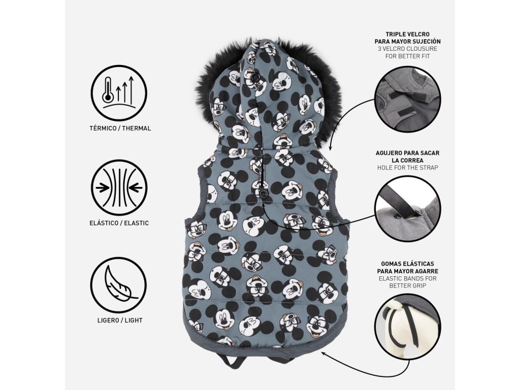 Zimní obleček, který zahřeje Vašeho psa s motivem Mickey. Velikost S, rozměry viz tabulka. S kapucí. Pohodlné navlíkání, zapínání na suchý zip. Nepromokavý, vyteplený. Materiál: 100% polyester. Hmotnost: 0,16 kg. Barva: šedo - černá. Výrobce: Cerda.