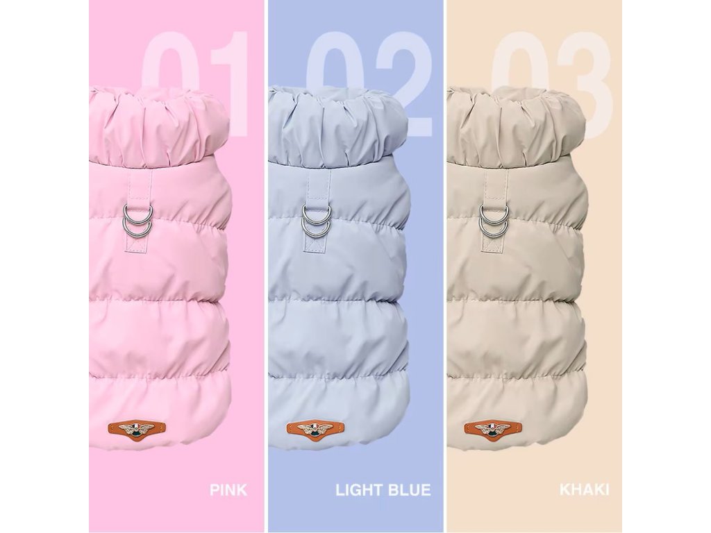 Praktická vesta pro pejsky, která zahřeje a ochrání před chladem. Díky bavlněné výplni bude ideální do podzimního a zimního období. Pohodlné zapínání na cvočky na bříšku umožní rychlé svlékání i oblékání. Vesta je vyrobena z kvalitních materiálů a poskytuje skvělou ochranu i proti větru, ideální do nepříznivého počasí. Vybírat můžete z růžové, modré nebo khaki varianty a velikosti jsou dostupné od S do XL.